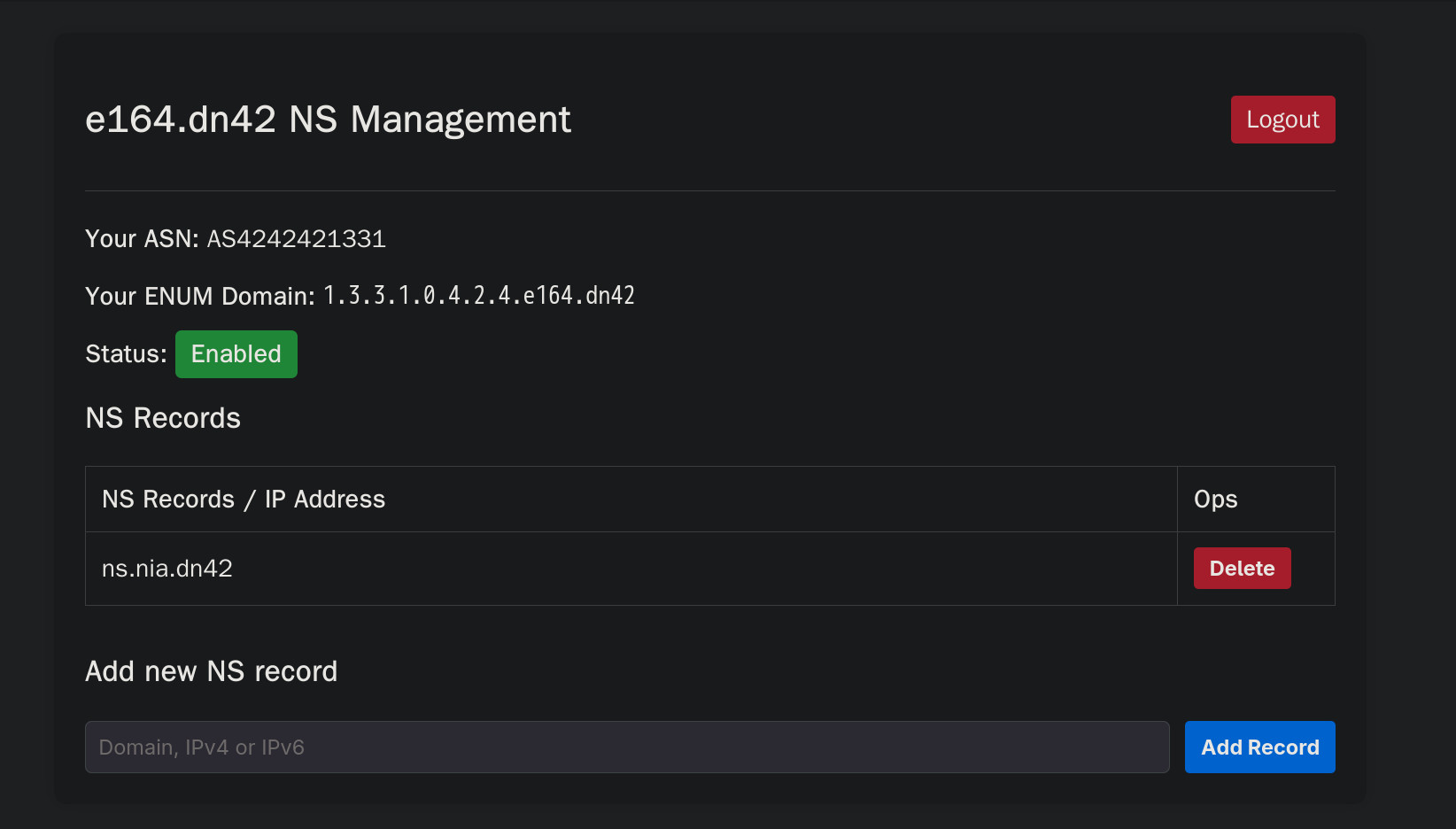 如果你有一个自己的 PBX 且希望加入,只需要通过 Kioubit Auth 登录 e164.dn42 的管理界面,设置 NS 记录指向的服务器,就可以将自己的 ASN 对应的 e164.dn42 域名 NS 委派到自己的权威 DNS 服务器上。